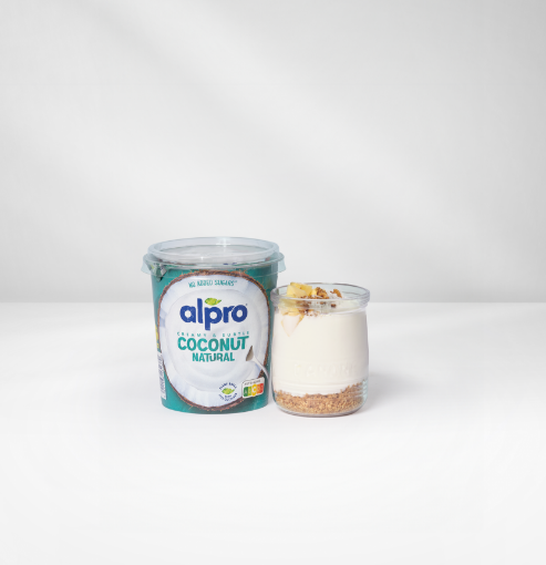 Disfruta de esta receta con yogurt Alpro de coco, mermelada, fresas y crumble.
